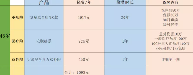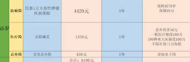 主要基于6000元每年保費的預(yù)算,45歲和50歲的重大疾病保險計劃采用消費型嚴重的疾病風險。在55歲時,它是防癌險,價格比重疾險便宜,抗癌健康告知更放松。一些有身體狀況的父母更容易通過核保。