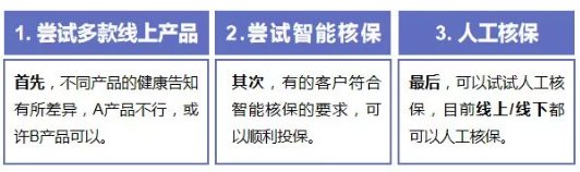 線上產(chǎn)品和智能核保都行不通,最后還可以進(jìn)行人工核保,目前線上/線下都可以,通過人工核保,得到最終的結(jié)果。