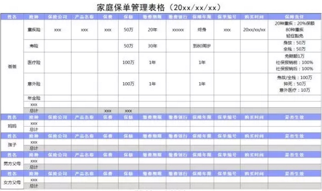 用這樣一張表格,我們可以清楚簡潔地看到,家庭成員的保障情況,誰還缺什么險(xiǎn)種,誰的保額不足等等,都非常明朗。通過保費(fèi)總計(jì)來調(diào)整自己的預(yù)算,通過保額來判斷自己是否還需要再加保等,一張表格就能掌握全家的投保情況,是非常方便的。