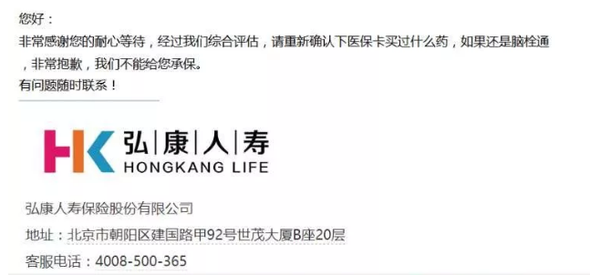 多保魚建議他向弘康人壽提交補(bǔ)充告知,保險(xiǎn)公司返回結(jié)果是:如果確認(rèn)是腦栓通,將拒絕承保。