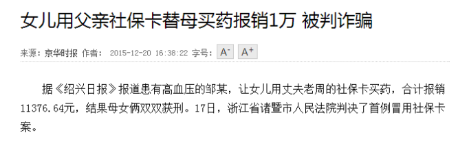 這不是危言聳聽。在2015年,就有新聞報(bào)道過,浙江一女子因冒用父親社??ㄌ婺赣H買藥報(bào)銷,與母親被雙雙判刑。