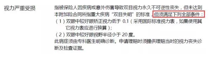 視力嚴重受損也是高發(fā)輕癥之一,保障的是雙目視力永久不可逆性受損,但又沒有達到重疾理賠標準的狀態(tài),實際上是降低了理賠標準。