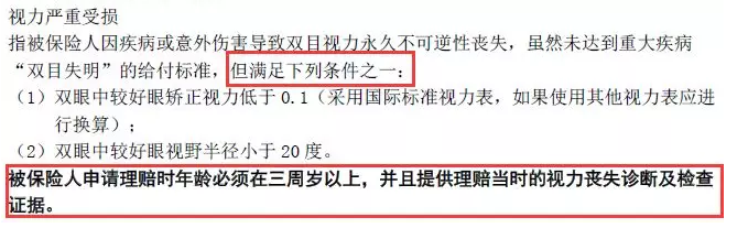 (要求被保險人理賠時年齡在3周歲以上,我們一般不視為缺點,因為3歲以前的小孩子因意外傷及眼睛的比較少,更多的為先天性視力疾病)