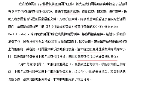 聯(lián)系上歐樂救援后,對(duì)方要求必須提供死亡證明、當(dāng)?shù)鼐綀?bào)告。歐樂的客服表示:“不確認(rèn)死亡證明,我們?cè)趺茨芴幚磉z體運(yùn)送呢。”