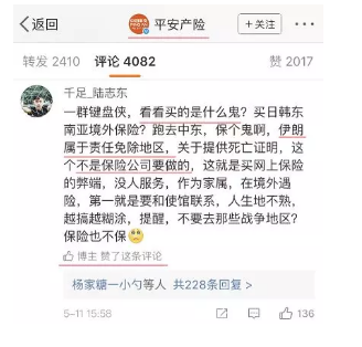 不僅如此,在這條微博下面,平安產(chǎn)險(xiǎn)的官方微博點(diǎn)贊了一條評(píng)論: