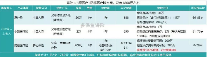 方案③:70歲以上的老人,意外+小額醫(yī)療+防癌醫(yī)療險(xiǎn)方案,花費(fèi)1800元左右