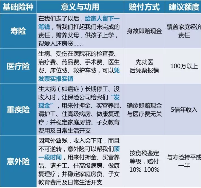 買保險,首先要搞清楚保險都有哪些類型,各自的作用是什么——壽險、醫(yī)療險、重疾險和意外險。如圖: