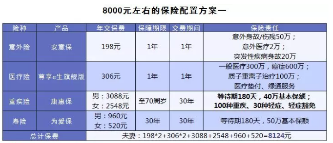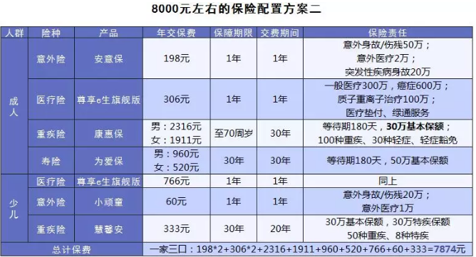 2)8000元左右,我們可以有兩種選擇,一是盡可能做高大人的保額,使保障更全面;另一種就是在保障了大人的基礎(chǔ)上,將剩下的預(yù)算給孩子買(mǎi)保險(xiǎn)。