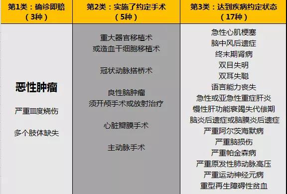 以這25種重疾為例,重疾的理賠大致可以分為三類(lèi):1、確診即賠;2、實(shí)施了某種手術(shù)才能賠;3、達(dá)到某種疾病狀態(tài)才能賠。