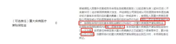 即:確診重疾后,在指定醫(yī)院治療的,每年給付一次額外10%基本保額的保險(xiǎn)金,持續(xù)至確診日后的第5個(gè)保單日,累計(jì)給付5次。