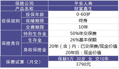 財(cái)富鑫生的交費(fèi)期限為10年,假設(shè)30歲的李女士投保該產(chǎn)品,基本保額5萬(wàn),月交保費(fèi)3790元。則: