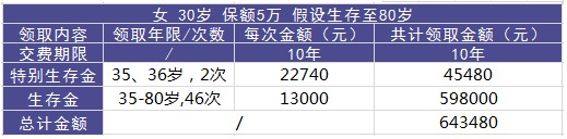 第5及第6年,每年按年交保費(fèi)的50%給付特別生存保險(xiǎn)金。
