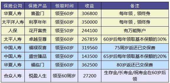 不同的產品,領的“金”不一樣,自然收益也就不一樣,但是這并不妨礙我們算它的收益,除去分紅和萬能賬戶,我們來看看表格中幾款產品的收益,他們是不是符合我們心目中能夠領到的錢呢?
