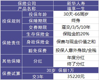 按男性 30歲,繳費3年,每年保額1萬來算,則猶豫期10天后、30歲-終身每年能領到2000元+20%累計紅利生存金。