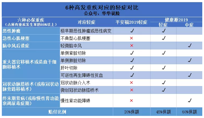 可以看出,覆蓋了與輕癥對應(yīng)的6種高發(fā)重疾,可以看出健康源2019的輕癥/中癥的保障更全面。