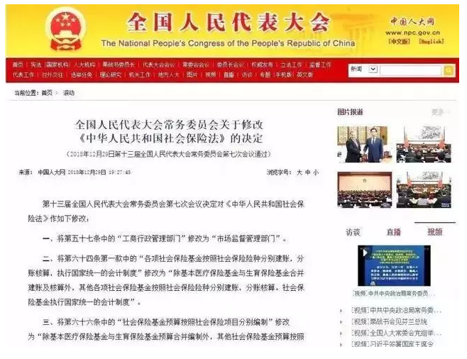 2018年12月29日,第十三屆全國(guó)人大常委會(huì)第七次會(huì)議通過《全國(guó)人民代表大會(huì)常務(wù)委員會(huì)關(guān)于修改〈中華人民共和國(guó)社會(huì)保險(xiǎn)法〉的決定》