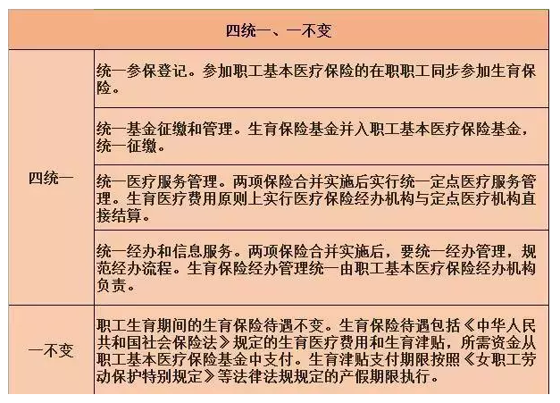 關(guān)于上述導(dǎo)頻程序的導(dǎo)頻內(nèi)容中,其概括為“四個(gè)統(tǒng)一的、和一個(gè)未改變的”。即統(tǒng)一保險(xiǎn)登記、統(tǒng)一資金收集和管理、統(tǒng)一醫(yī)療服務(wù)管理、統(tǒng)一管理和信息服務(wù),生育期間的生育保險(xiǎn)待遇保持不變。具體如下: