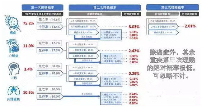 2)心臟病后第二次心臟復發(fā)的概率為2.42%;所有其他責任,無論是患有癌癥和其他嚴重疾病,還是患有其他嚴重疾病和癌癥,都不會超過2%。