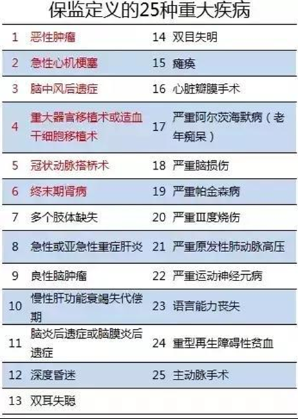 2007年,中國頒布并實施了由中國保險行業(yè)協(xié)會和中國醫(yī)師協(xié)會聯(lián)合開發(fā)的《重大疾病保險的疾病定義使用規(guī)范》。任何保險公司的重大疾病產(chǎn)品必須涵蓋標(biāo)準(zhǔn)、疾病狀態(tài)或手術(shù)的疾病范圍。
