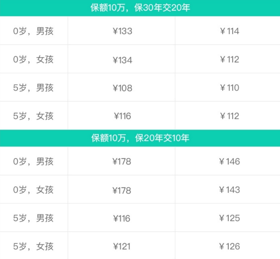 首先來看看它的比率:0歲男孩,500,000,支付20年,包括輕癥,保到30歲,每年665元。