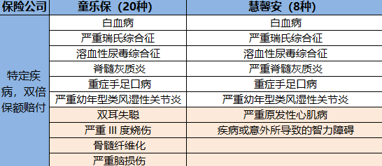 其中童樂保含有高危疾病,白血病,嚴重的手足口病,燒傷,腦損傷,而慧馨安8種,但基本上重病是重合的,整體差異并不大。