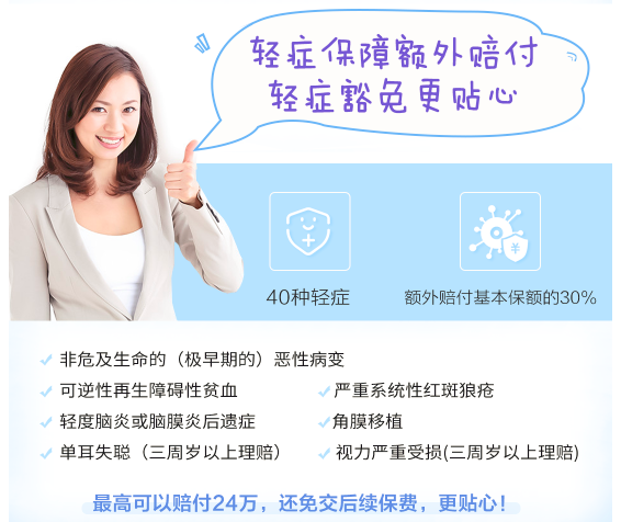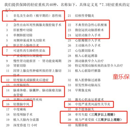 中荷生命童樂保兒童的重大疾病,其中輕疾額外30%的保險金額,輕度疾病后保險費用豁免,剩余重病保障責任繼續(xù)有效,輕癥疾病類型40種,也非常完整,比慧馨安的35輕疾多一點,但基本的輕疾是完整的,這種差異