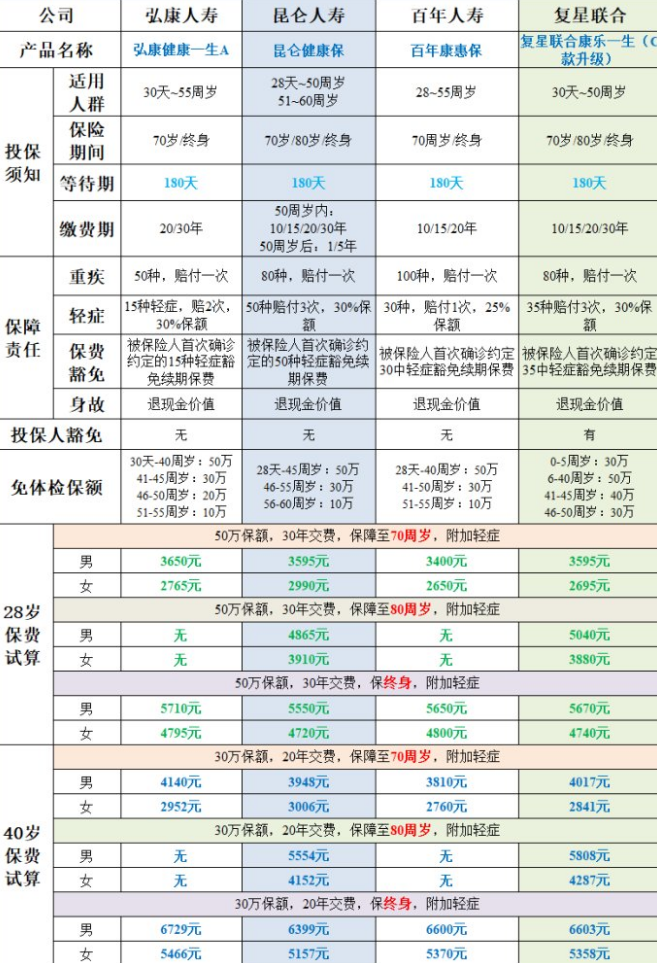 2、從保障責(zé)任的角度來看,嚴(yán)重的情況只能支付一次,弘康、昆侖、復(fù)星聯(lián)合的輕癥可以多次支付,如果你更看中賠付次數(shù),你可以選擇這些;另外弘康、昆侖、百年的輕癥可以選擇是否附加,復(fù)星聯(lián)合默認(rèn)自帶輕癥,如果你只注意嚴(yán)重的情況你可以選擇弘康、昆侖、百年的產(chǎn)品;在合同有效期內(nèi),退保(不建議)或死亡可以退還現(xiàn)金價值(罕見);四個產(chǎn)品輕癥可以是豁免后面的保險費用。