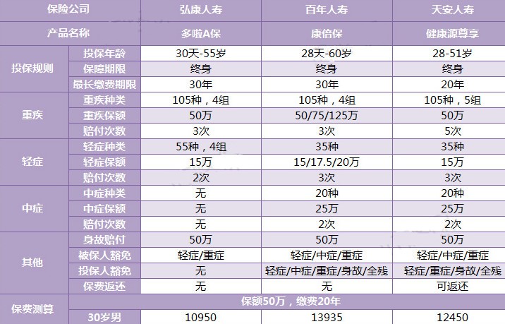 (3)如果追求高性價比:百年人壽康倍保保費(fèi)是最貴的,但它高于天安人壽健康源,在第二次、三次輕癥和重病賠付比例是更高;弘康多啦A保最便宜,最重要的原因是它沒有中癥保障,遵循廉價的、足夠的邏輯,無論如何比較,從保費(fèi)開支都是這里最低的。