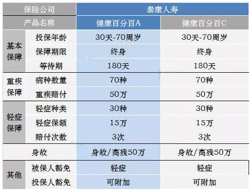 健康百分百是泰康人壽重大疾病保險(xiǎn)中的重點(diǎn)產(chǎn)品,有A、B、C三款,對(duì)于A和C款,多保魚做了詳細(xì)的比較,發(fā)現(xiàn):