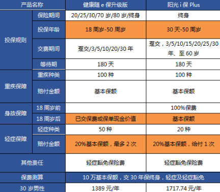 2.投保年齡:健康隨e保升級版,升級的重點是嚴重疾病的類型和輕癥賠付,但暫時只升級到成人版,所以保險年齡是18歲 - 50歲。陽光i保險是30至50周齡,30天至17歲可保到50萬,全部201個城市。