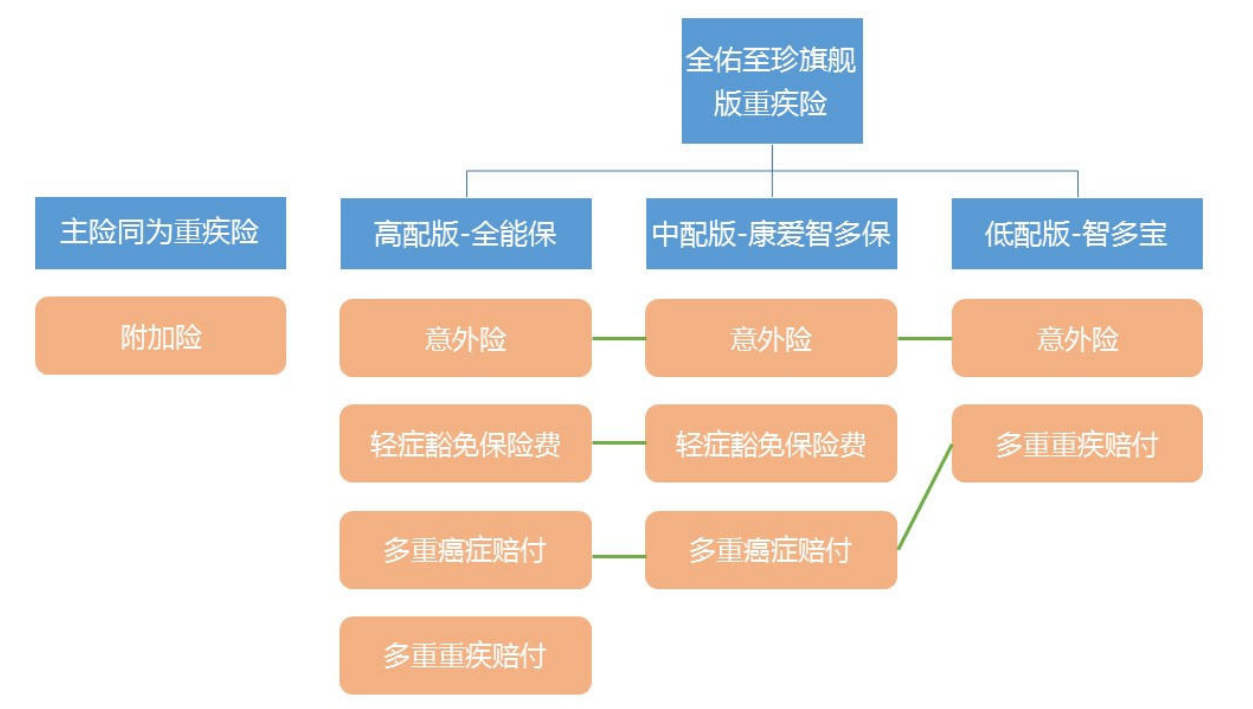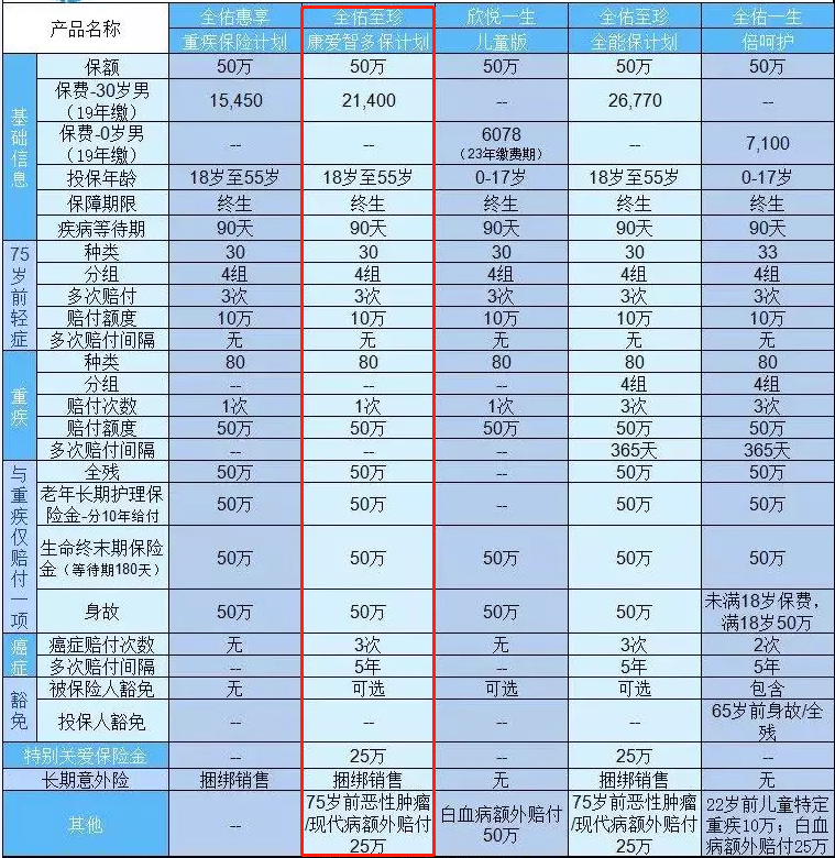 也就是說,主險是重大疾病保險的全佑至珍旗艦版其實(shí)共有三種產(chǎn)品:全佑至珍旗艦版康愛智多保計劃、全佑至珍旗艦版全能保計劃、全佑至珍旗艦版智多寶計劃康愛智多保的特征是輕癥豁免,以及多重癌癥賠付;而全能保的特點(diǎn)是添加了輕癥豁免、多重癌癥賠付、多重重疾病賠付,保障很“全能”。