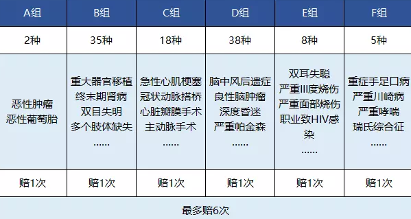 可以看出,該產(chǎn)品將106種嚴(yán)重疾病分為6組,每組包含數(shù)種至數(shù)十種疾病。只要賠付在某一組中有某種疾病,整個(gè)組的疾病就會(huì)丟失保障。例如,在賠付急性心肌梗死后,C組中的18種嚴(yán)重疾病不再是保障。