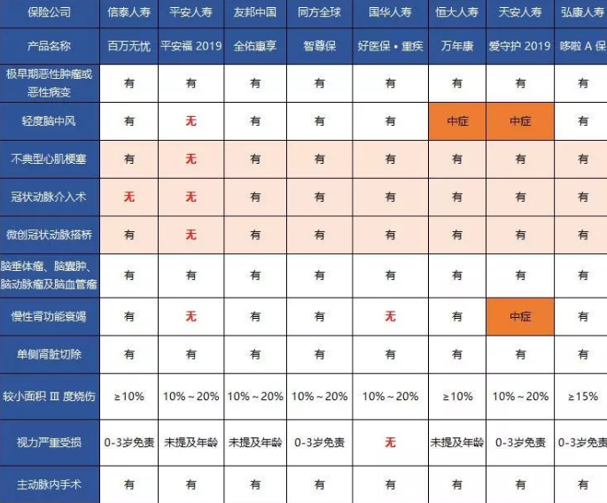 我整理了各種高發(fā)輕癥,有些產(chǎn)品會(huì)將輕癥升級(jí)到中癥,賠付更多的保額,這里也列出了。詳情如下: