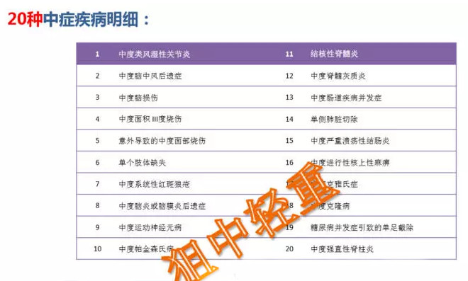 疾病類型:20種,無分組,每個(gè)賠付保額的60%,最多賠2次;