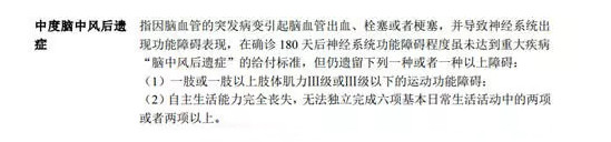 這種疾病是今年市場上疾病的一個(gè)新定義。其實(shí)質(zhì)是將高發(fā)的輕癥定義為中癥,并將其增加賠付保額。讓我們看看同一輕度中風(fēng)和中度中風(fēng)后遺癥的定義;