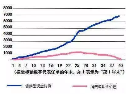 為了找出現(xiàn)金價值的走勢,我們使用儲蓄類終身壽險和消費類定期壽險作為例子。