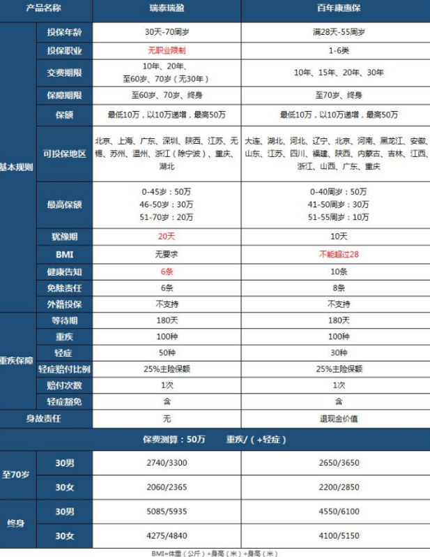 此外,瑞泰瑞盈有一個(gè)小優(yōu)勢(shì),并且不需要被保險(xiǎn)人的BMI指數(shù)。例如,在百年康惠保中,被保險(xiǎn)人的BMI不得超過28。這意味著如果保險(xiǎn)指數(shù)不符合標(biāo)準(zhǔn),但身體沒有異常,則可能無法確保這一重大疾病保險(xiǎn),或做核保處理。但瑞盈顯然更友好。