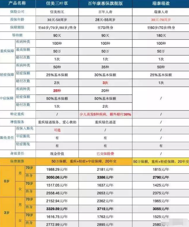 首先看看信美三葉草、百年康惠保旗艦版和瑞泰瑞盈三款長期重大疾病保險(xiǎn)評(píng)估: