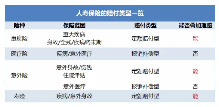 從上表中可以清楚地看出,如果投保多個(gè)保險(xiǎn),則定額賠付類型的保險(xiǎn)可以與理賠疊加,而報(bào)銷補(bǔ)償保險(xiǎn)不能與理賠疊加。
