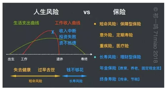 看第一張圖,綠線是支出曲線。在這一生中,人們?cè)诶狭瞬〉臅r(shí)候不得不花錢。如果退休后收入不夠,或者因?yàn)槭I(yè)、投資失敗,這筆錢還不夠。我們稱之為長(zhǎng)壽風(fēng)險(xiǎn)。它對(duì)應(yīng)于金融保險(xiǎn),例如最常見(jiàn)的年金保險(xiǎn)和終身壽險(xiǎn)。