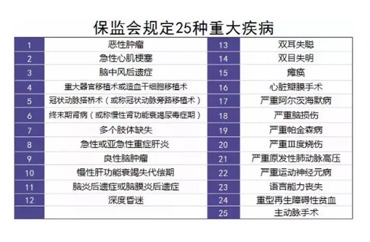 保監(jiān)會規(guī)定大陸重疾的25種重大疾病,而這25種重大疾病,已經(jīng)占了所有重疾理賠的95%以上: