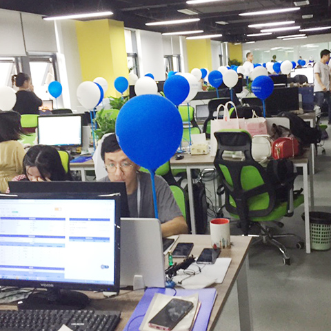 (公司整個(gè)工位上都放有藍(lán)白相間的氣球,遠(yuǎn)遠(yuǎn)望去就像一片藍(lán)藍(lán)的大海一樣,也希望多保魚(yú)這條小魚(yú)在互聯(lián)網(wǎng)金融的大海之上乘風(fēng)破浪,勇往直前。)